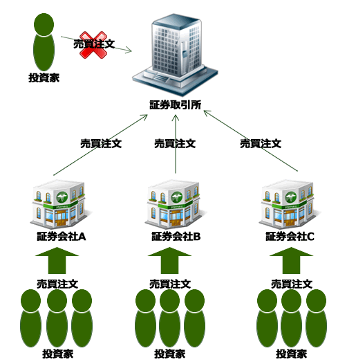 投資家は証券会社に対して株式の売買注文を出し、それを証券会社が仲介する形で証券取引所へと売買注文を出します。その上で証券取引所内で株式の売買が成立します。